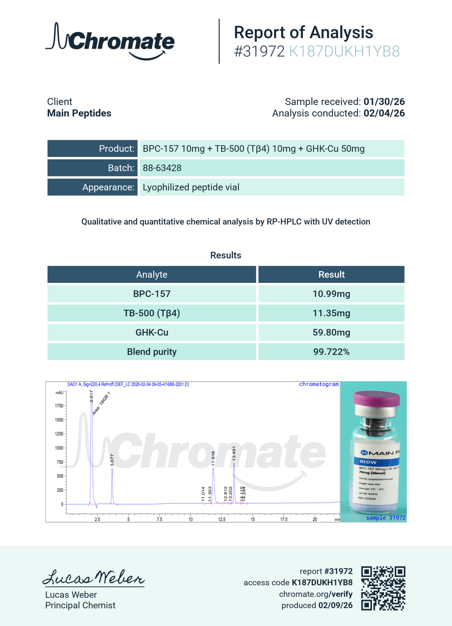 GLOW Blend is a targeted peptide formulation combining GHK-Cu (50 mg), TB-500 (10 mg), and BPC-157 (10 mg) per unit, designed to support in vitro research on skin regeneration, cellular repair, and extracellular matrix modulation. GHK-Cu is a copper-binding tripeptide widely studied for its role in collagen production, tissue remodeling, and gene regulation. TB-500 and BPC-157 are synthetic peptides explored for their synergistic effects on angiogenesis, inflammation control, and fibroblast migration. This blend is ideal for research into dermal repair and regenerative signaling pathways.