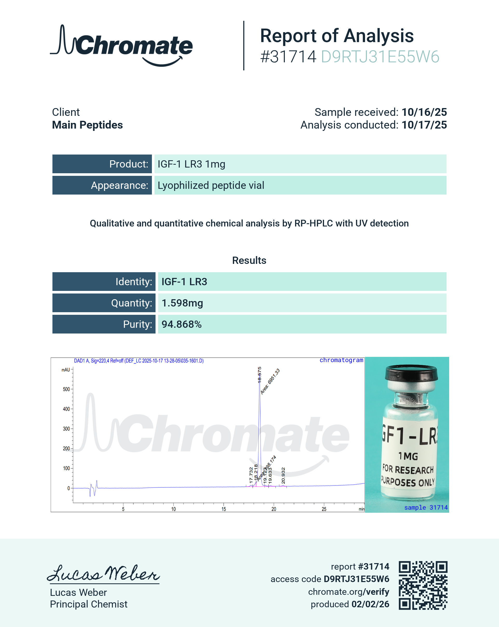 Insulin-like Growth Factor 1 Long R3 (IGF-1 LR3) is a recombinant analog of IGF-1 with an extended half-life and reduced affinity for IGF-binding proteins. It is widely studied for its role in cell proliferation, anabolic signaling, and tissue repair models. IGF-1 LR3 is strictly intended for in vitro research and is not for human or veterinary use.