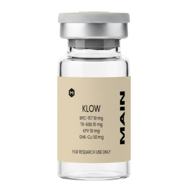 KLOW Blend is a multi-peptide research formulation combining GHK-Cu (50 mg), BPC-157 (10 mg), TB-500 (10 mg), and KPV (10 mg), designed to support studies in tissue regeneration, cellular signaling, and inflammatory modulation. GHK-Cu is a copper-binding tripeptide studied for its role in wound repair and gene expression. BPC-157 and TB-500 are synthetic peptides commonly explored for their impact on angiogenesis, fibroblast activity, and cytoskeletal regulation. KPV, a tripeptide derived from ?-MSH, is researched for its anti-inflammatory properties via melanocortin receptor pathways.
