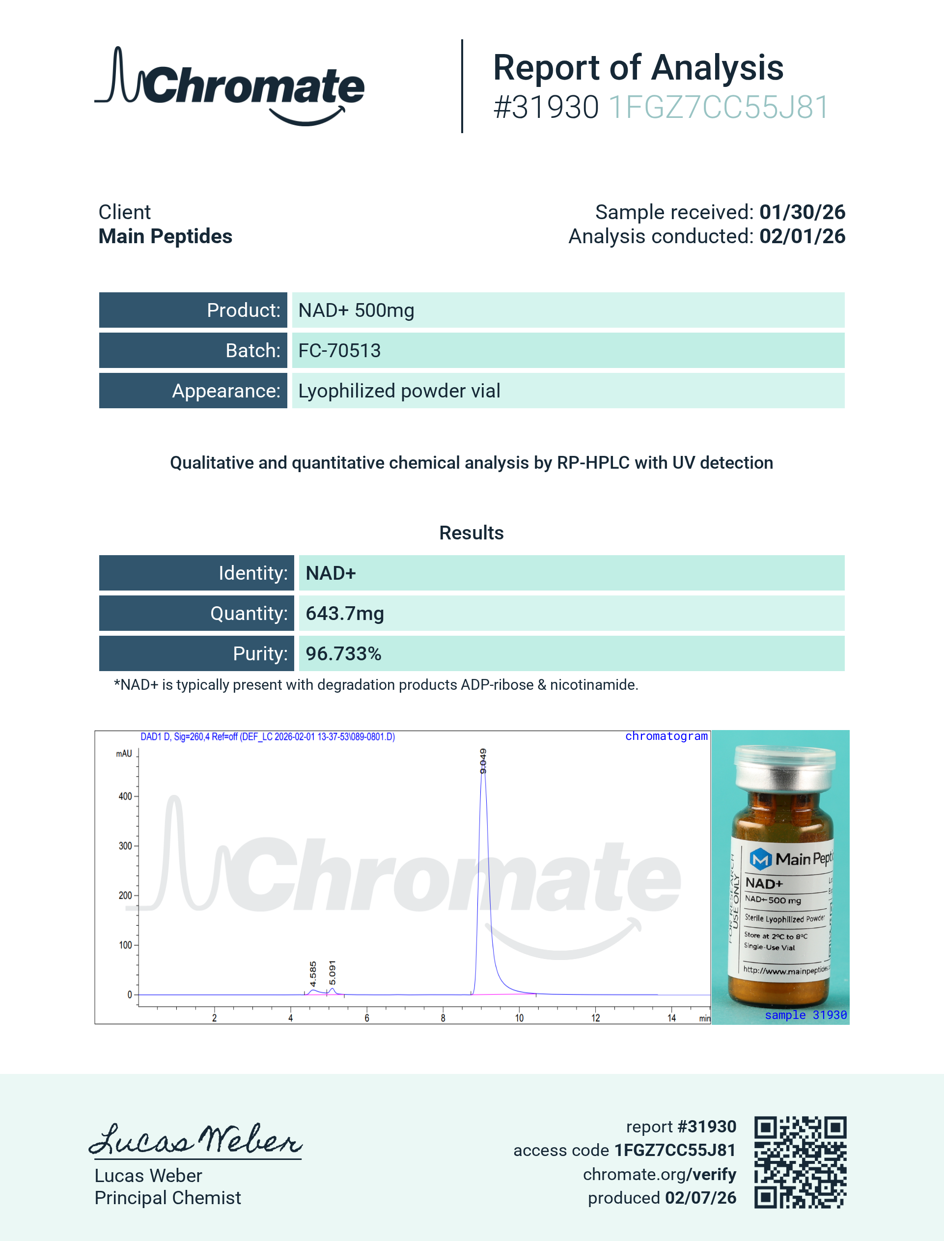 NAD+ is a crucial coenzyme found in all living cells, acting as an electron carrier in redox reactions and playing a key role in cellular metabolism. It exists in both oxidized (NAD?) and reduced (NADH) forms. Research has focused on NAD? in relation to mitochondrial function, sirtuin activity, and DNA repair mechanisms. In laboratory settings, NAD? is frequently utilized to study energy homeostasis, enzymatic reactions, and age-related cellular pathways.